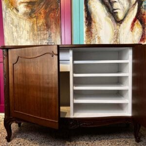 The sideboard is constructed out of walnut and walnut veneer. It is decorated with hand-carved details and features two curved doors. The two front doors enclose a fitted shelf interior on the right and pull-out drawers on the left, painted in white to provide a light and clear view of the contents. The piece has a slight serpentine bow front.