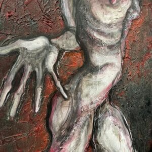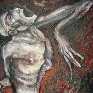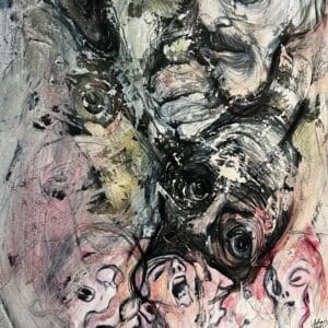 This striking mixed media work on canvas (90×126 cm) delves into the profound anxiety of death, transcending personal discomfort to embody the shared unease of humanity. A bold exploration of emotion and mortality, it is available for $1,500.