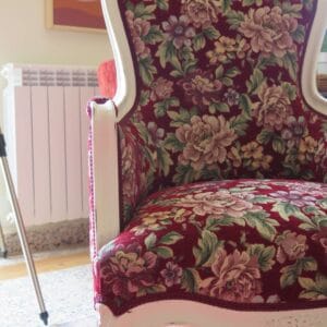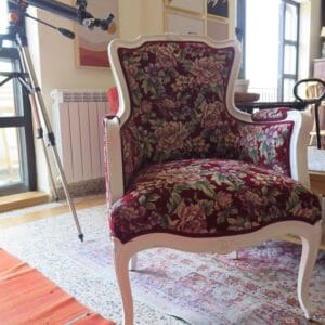 Louis XV Bergère – Rose Ornament: Painted in white with an intentionally distressed finish for an authentic vintage look. This original vintage piece has been refurbished while preserving its classic charm. Crafted with high-quality wood and fabric, it features a special rose pattern on the fabric, adding a touch of spring elegance.