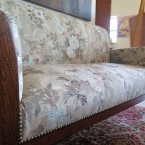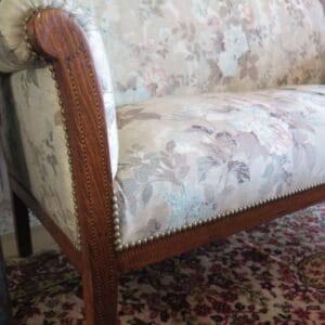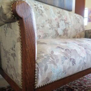 2-Seater Sofa: A classic vintage piece in English style with traditional English upholstery techniques. Features special handcrafted wood marquetry, adding an elegant touch.