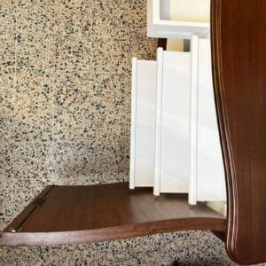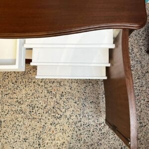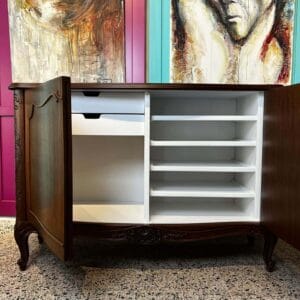 The sideboard is constructed out of walnut and walnut veneer. It is decorated with hand-carved details and features two curved doors. The two front doors enclose a fitted shelf interior on the right and pull-out drawers on the left, painted in white to provide a light and clear view of the contents. The piece has a slight serpentine bow front.